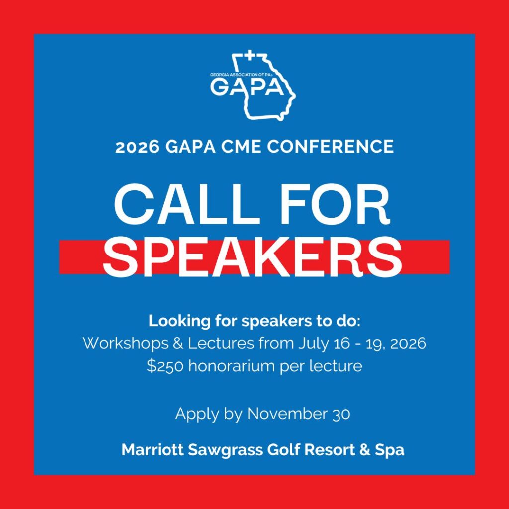 The Georgia Association of PAs is seeking presentation proposals for our 2026 Annual CME Conference being held Wednesday, July 16 – Sunday, July 19, 2026 at the Marriott Sawgrass Golf Resort & Spa at 1000 Tournament Players Club Blvd, Ponte Vedra Beach, FL 32082. Your proposal should be formatted for a one (1) hour session (50-minute presentation with 5 minutes for questions at the end) or hands-on workshops 2- 4 hours.