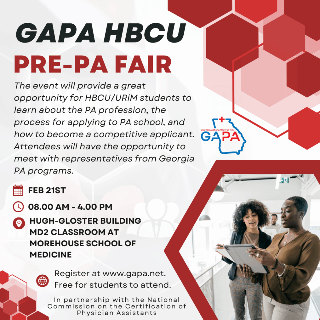 This Annual event will provides a great opportunity for HBCU/URiM students to learn about the PA profession, the process of applying to PA school, and how to become a competitive applicant. Attendees will have the opportunity to meet with representatives from Georgia PA programs.